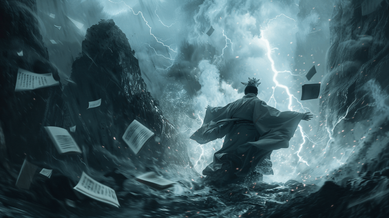 菅原道真が雷神へと変貌する瞬間を捉えたこの作品で、永濯は前代未聞の技法を用いた。綿布に墨と膠彩料、そして西洋の水彩絵具を併用するという、当時誰も試みたことのない方法である。さらに驚くべきは、その構図だった。稲光に打たれ、硬直する身体。震える手から落ちる杖。宙を舞う冠と紙。すべてが動いている。それまでの日本画が永遠に静止した理想の瞬間を描いたのに対し、永濯は変化の一瞬を切り取ったのである。