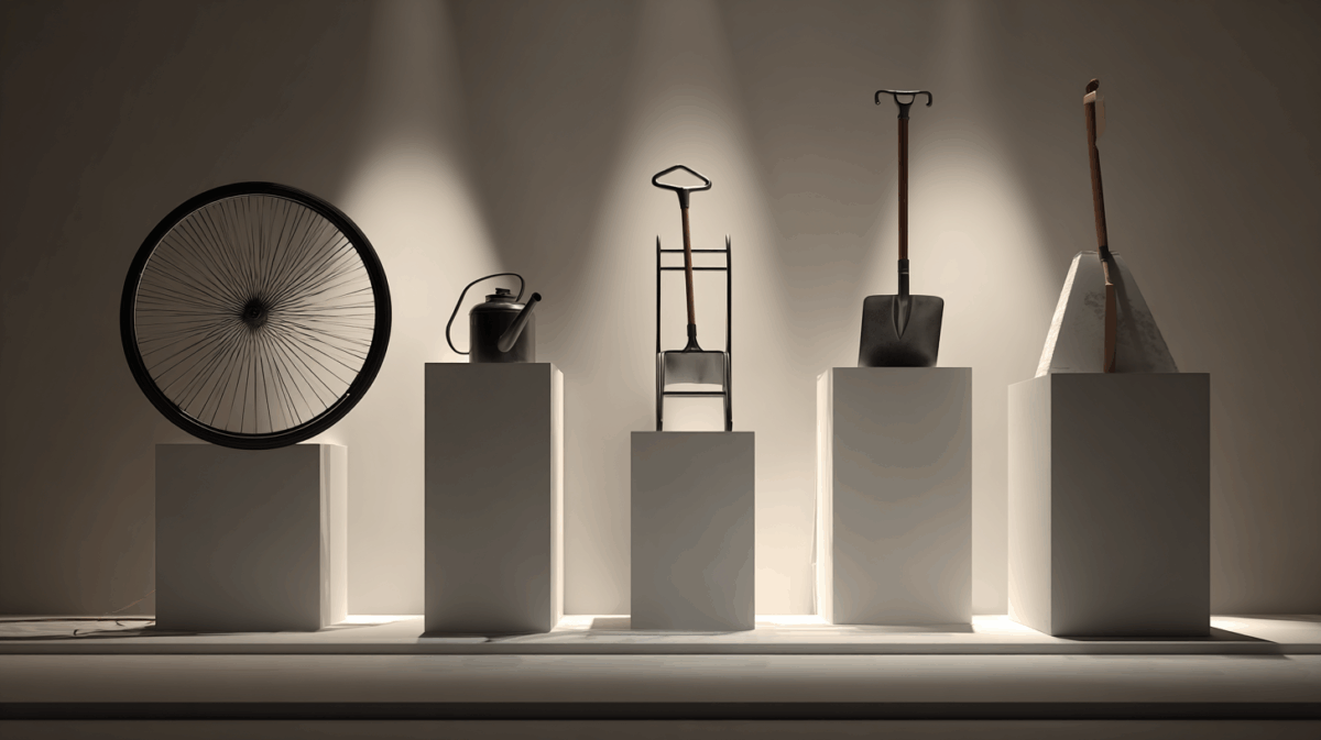 デュシャンの最初にして最大の発明は、「選ぶ」という行為そのものを創作と定義したことでした。1913年、彼は自転車の車輪を木製のスツールに逆さに取り付けた《自転車の車輪》を制作します。これが最初のレディメイド——既製品をそのまま芸術作品として提示するという手法——の原型とされています。1914年には鉄製の瓶乾燥器《ボトルラック》を、1915年には雪かきスコップに「折れた腕の前に」という題名をつけました。