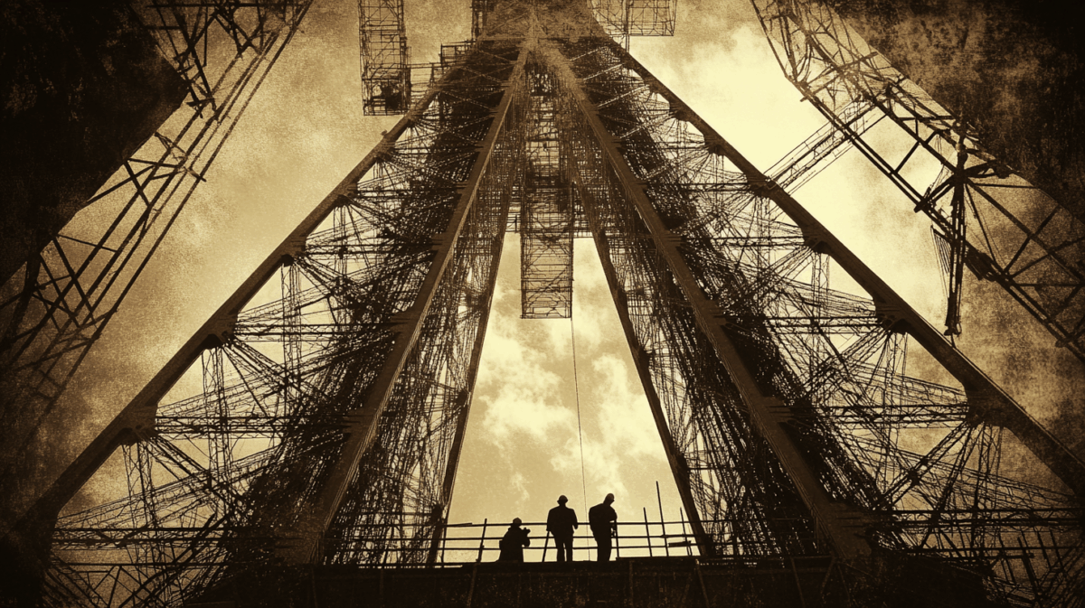 1887年1月28日、起工式。反対の声が渦巻く中、工事は始まりました。パリ万博の開幕は1889年5月。その間わずか約2年。300メートルの鉄塔を、当時の技術で建て切らなければなりません。